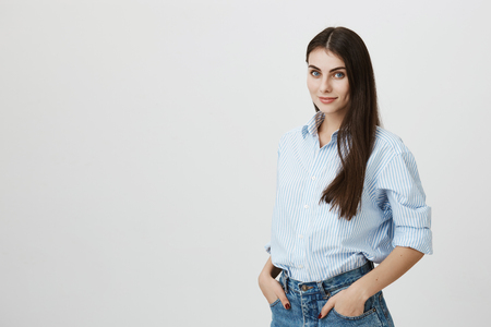 ポケットに手を入れた中途半端なかわいいヨーロッパのビジネスウーマンは グレーの背景の上に立って 自信と準備を表現しています 銀行員は 最高のサービスを提供することを保証します の写真素材 画像素材 Image